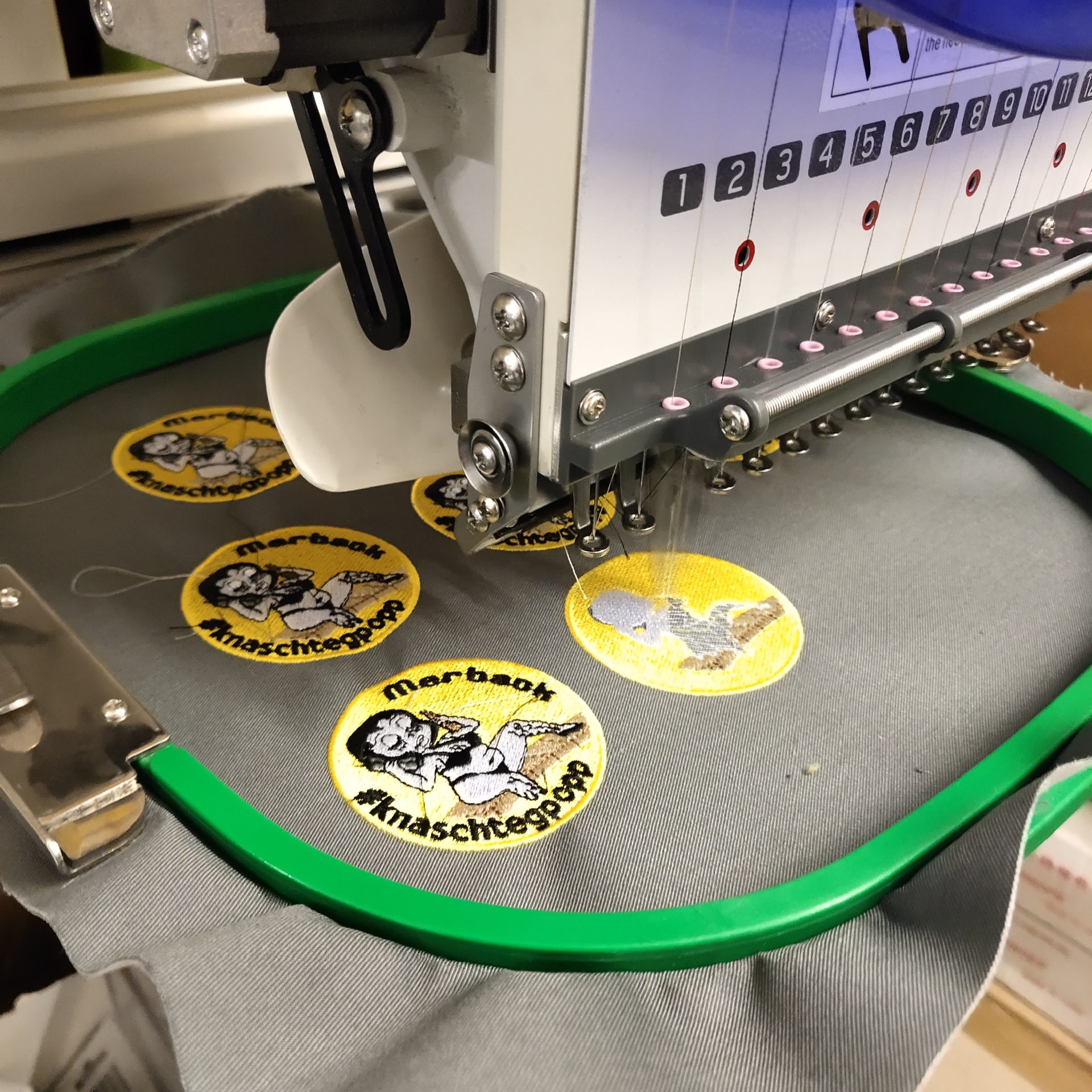 Dafür sollten wir das Logo etwas umändern. Um eine saubere Qualität zu erhalten, haben wir für die Mützen einen Patch bestickt, welcher dann nachträglich auf die Mützen genäht wurde. Den Schriftzug #knaschtegpopp wurde direkt auf die Mütze bestickt.